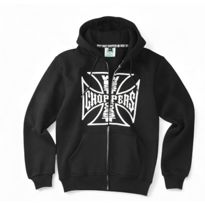 BLACK BEEFY ZIP HOODY, MADE OF 330 GRAMS 80% COTTON-20% POLYESTER FABRIC. THE WEST COAST CHOPPERS OG LOGO ON THE FRONT is FULLY EMBROIDERED over the zipper.